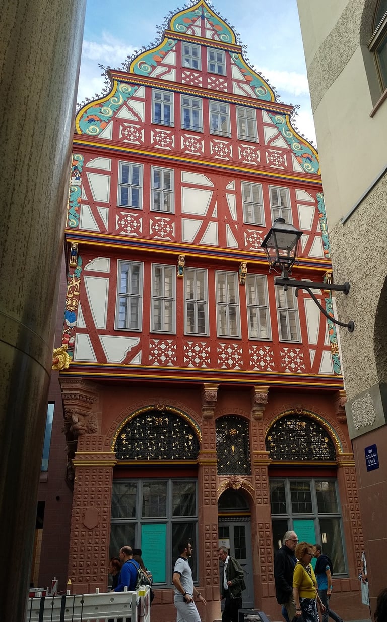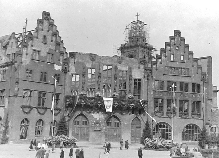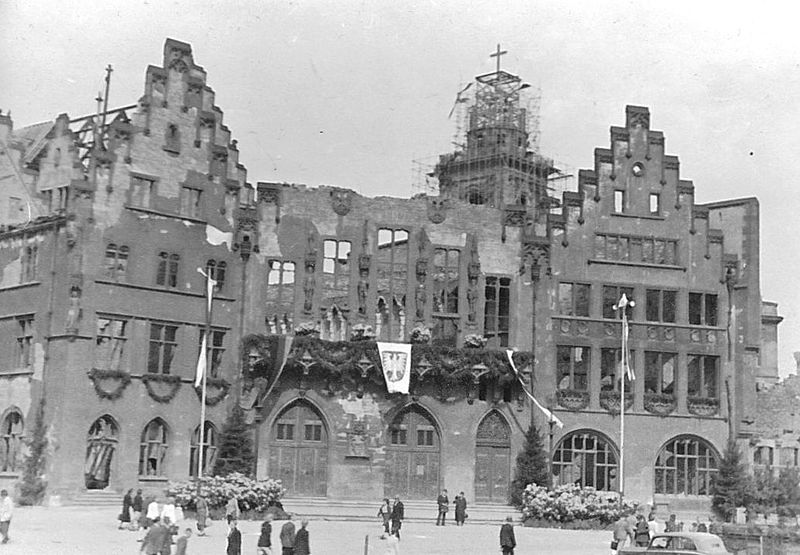 1955 wurde das Ensemble feierlich neu eröffnet. Von außen originalgetreu wiederhergestellt, innen waren allerdings viele Veränderungen vorgenommen worden – es war nun schlichter, übersichtlicher. Die Rekonstruktion war von vielen Diskussionen begleitet worden; Diskussionen, die sich auf alle zerstörten Bereiche Frankfurts erstreckten und, wie ich am Anfang von Teil 1 dieses Artikels erwähnte, dazu führten, dass scheußliche Bausünden an die Stelle kunstvoller Gebäude traten. Deshalb dauerte es über sechzig Jahre, bis Frankfurt seine Altstadt zurückbekam – oder vielmehr eine neue Altstadt bekam. Joseph II. und die anderen in Frankfurt gekrönten Kaiser hätten den Weg, den sie nach ihrer Krönung vom Dom zum Römer zurücklegten, in Nachkriegszeiten nicht wiedererkannt, hätte er sie doch an der Abscheulichkeit des Technischen Rathauses vorbeigeführt. Ich weiß noch, wie unangenehm ich es immer fand, nach der Beschaulichkeit des Römers diesen seelenlosen Klotz zu sehen.