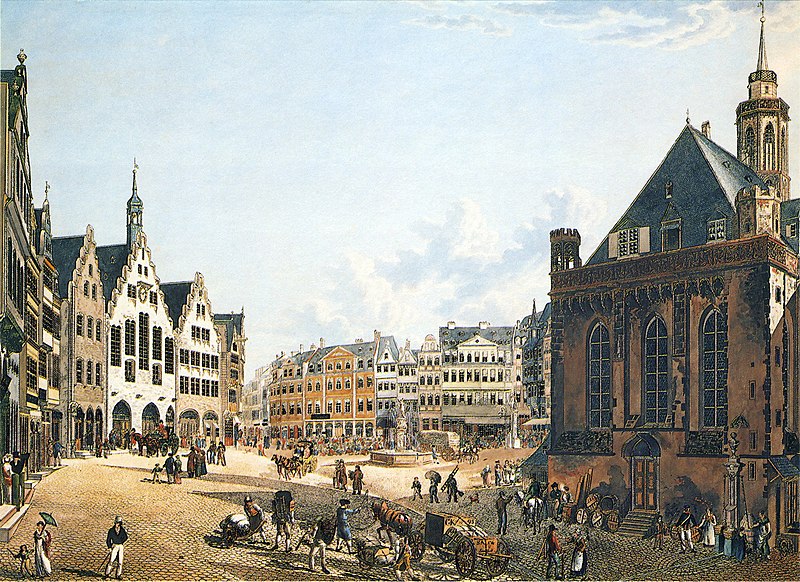 Teil 1 unserer historischen Wanderung durch Frankfurt hat uns bis zur Paulskirche geführt. Von ihr ist es nicht weit zu Frankfurts wohl berühmtesten Platz: dem Römerberg. Er ziert fast jeden Artikel, fast jeden Bucheinband über Frankfurt, was genau der Grund ist, aus dem er auf den Wallenfels-Einbänden nicht zu sehen ist. Frankfurt ist so viel mehr als der Römerberg. Allerdings sind er und der Römer selbst sicher eine der charakteristischsten Ansichten der Stadt. Doch was ist der Römer eigentlich? Das aus drei miteinander harmonierenden Häusern bestehende Ensemble ist schon seit sechshundert Jahren das Rathaus der Stadt Frankfurt und der Schauplatz zahlreicher historischer Ereignisse. Die Kaiserkrönungen wurden hier gefeiert, wichtige Gäste zeigen sich auch heute hier auf dem Balkon der Menge, die für Frankfurt demütigende Annexion der Stadt durch Preußen wurde hier 1866 – vor einem denkbar unbeeindruckten Publikum – verkündet, wie ich in Der Wahrheit Flamme beschrieb: