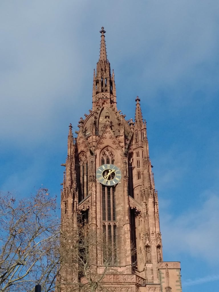 Wenn man die Goldene Waage erreicht hat, ist man auch schon fast am Dom. Auf alten Bildern Frankfurts erhebt sich sein Turm weit über die restliche Stadt, wie zum Beispiel auf dem um 1820 entstandenen Bild von Anton Radl, „Ansicht der Stadt Frankfurt vom Mühlberg“, welches das Titelbild von „Der Freiheit Kraft“ ziert. Mittlerweile geht er angesichts der Skyline fast unter, aber vom Sachsenhäuser Ufer aus kann man die Skyline wortwörtlich links liegen lassen und sieht ihn über die Altstadt ragen. Dem sorgfältigen Beobachter wird auffallen, daß der Domturm auf ebenjenen alten Bildern anders aussieht als heute – ihm fehlte die Spitze, was ihm damals den Spitznamen „Schlafmütze“ einbrachte. Geplant war er anders – nämlich so, wie man ihn heute sieht –, doch wurde nach 99 Jahren Bauzeit der Turm im Jahre 1514 ohne die geplante Spitze fertiggestellt. 1867 stand der Dom in Flammen und erhielt im Wiederaufbau dann die vierhundert Jahre zuvor geplante Spitze. Die genauen Hergänge um Brand und Wiederaufbau habe ich hier berichtet. Auch in diesem Artikel findet sich eine gute Beschreibung der Bautätigkeit im Mittelalter.