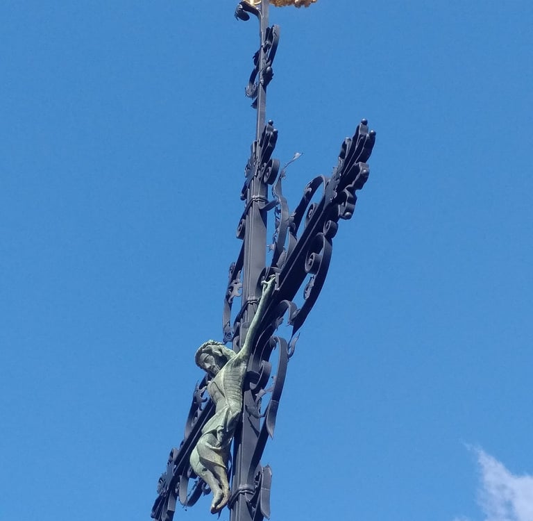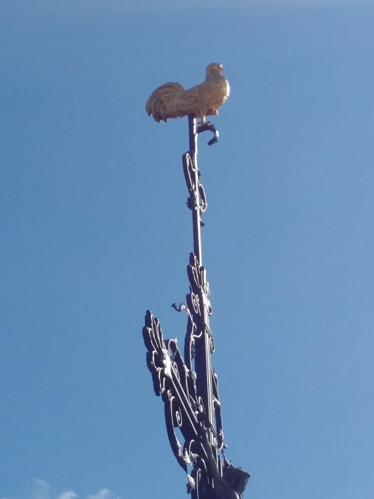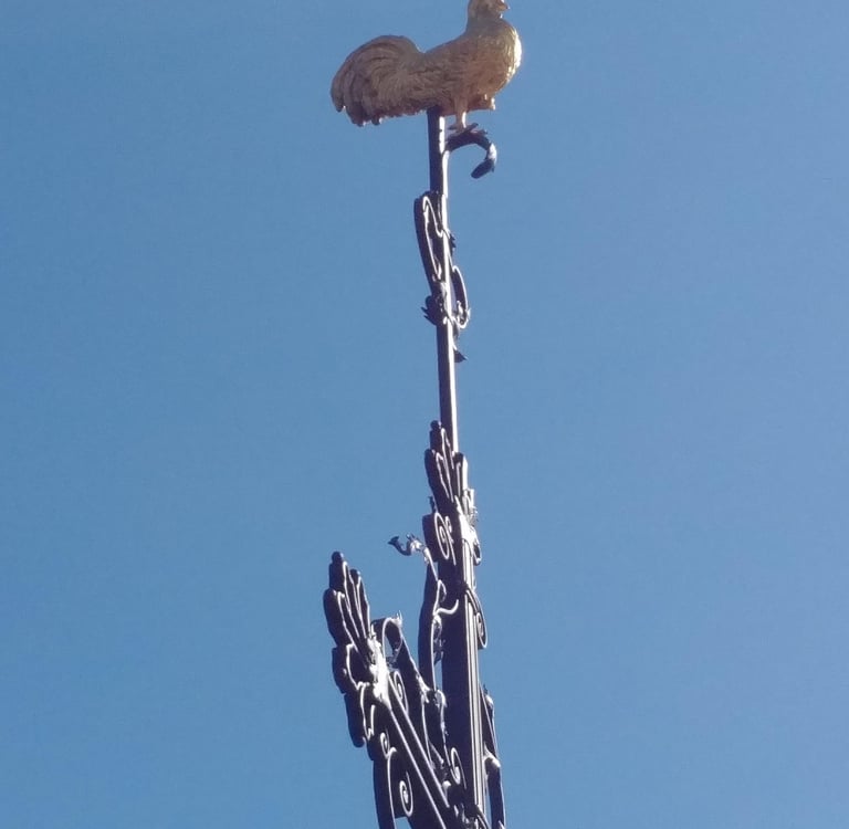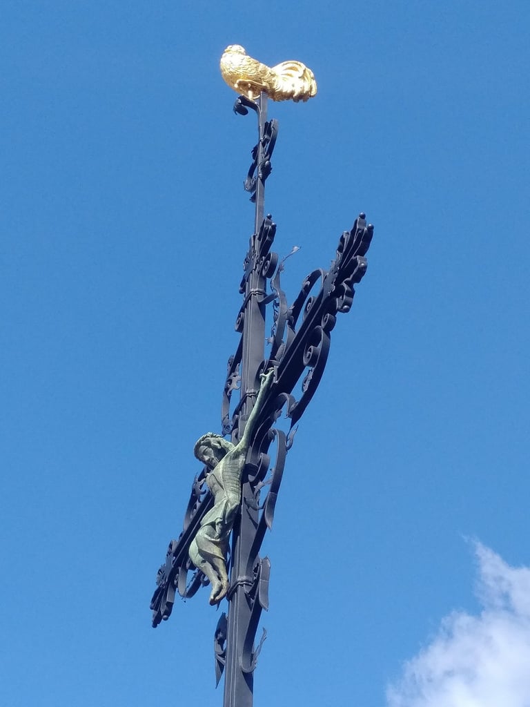 Letztlich ist der Hahn, der auf einem Kruzifix sitzt, von symbolischer Bedeutung. Ein Hahn ist wachsam und zudem ein Symbol der Buße, denn immerhin ist es der Hahnenschrei, der Petrus bewusst macht, daß er Jesus dreimal verleugnet hat.