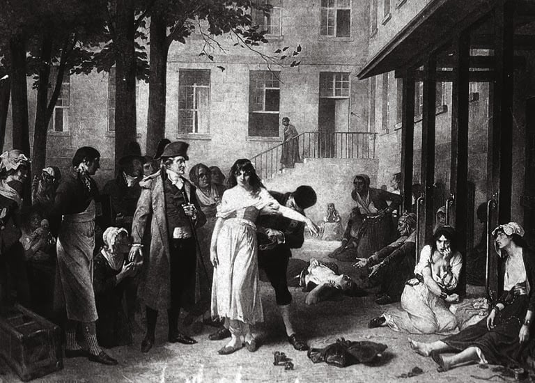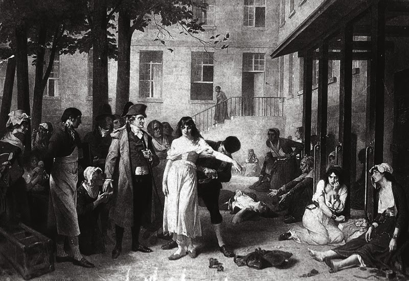 Die moralische Behandlung wollte von Gewalt und Fesselungen wegkommen. Das Bild zeigt den französischen Psychiater Philippe Pinel, der Asylbewohner von ihren Fesseln befreite. Patienten sollten sanft behandelt werden, Spaziergänge in sauberer Luft, leichte Unterhaltung genießen. Das Leben in einer geordneten Umgebung mit regelmäßigen Mahlzeiten, sozialer Interaktion und Regelmäßigkeit sollte sie (zurück) zu einem moralischen Lebensstil führen. Fesseln wurden jedoch immer noch in vielen amerikanischen Anstalten benutzt. Es gab zahlreiche Diskussionen in wissenschaftlichen Zeitschriften über die Notwendigkeit von Einschränkungen und die Wirksamkeit moralischer Behandlung.