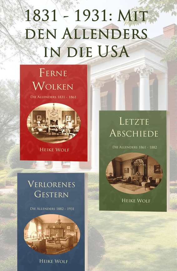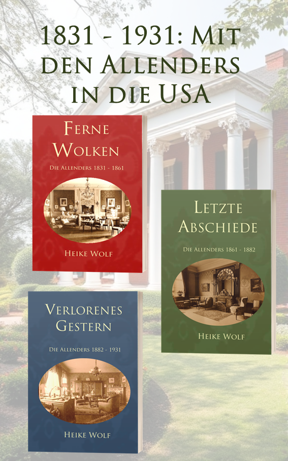 Als ich in den USA in der wundervollen Stadt Philadelphia wohnte, deren koloniales Viertel Society Hill Geschichte geradezu ausstrahlt, war es nur natürlich, mich an die Geschichte einer amerikanischen Familie zu setzen. Die Vereinigten Staaten sind so vielfältig, daß ich mich für die Trilogie über die Familie Allender nicht auf einen Ort beschränken konnte. Die Allender-Trilogie schrieb ich auf Englisch. Mittlerweile habe ich sie auf Deutsch übersetzt. Die amerikanische Geschichte ist schon aufgrund der Größe des Landes sehr vielfältig, insbesondere im 19. und frühen 20. Jahrhundert. Während die Ostküstenstädte im 19. Jahrhundert schon recht fortschrittlich waren, konnte eine Reise Richtung Westen auch fast wie eine Reise zurück in der Zeit empfunden werden. Texas war in den 1830ern / 1840ern mitten in der Pionierzeit, die (damals) modernen Errungenschaften von Philadelphia lagen für Texaner noch in weiter Ferne. Das Leben im Alten Süden war hinsichtlich Gesellschaftsstruktur und Alltag im Vergleich zu den Nordstaaten wie das eines anderen Landes. All diese Facetten der damaligen USA sind viel zu spannend, um sie unerwähnt zu lassen und so verteilen sich die Allenders der ersten Generation über das ganze Land. Unrealistisch ist es nicht, dass vier Söhne einer Familie zu jener Zeit in unterschiedlichen Gebieten wohnen – abgesehen davon, dass ihre kleine Heimatstadt in Kentucky nicht viele Entwicklungsmöglichkeiten bot, zog es die Amerikaner jener Zeit oft weit von ihrem Geburtsort weg, auf der Suche nach Abenteuern, Land, Reichtum.