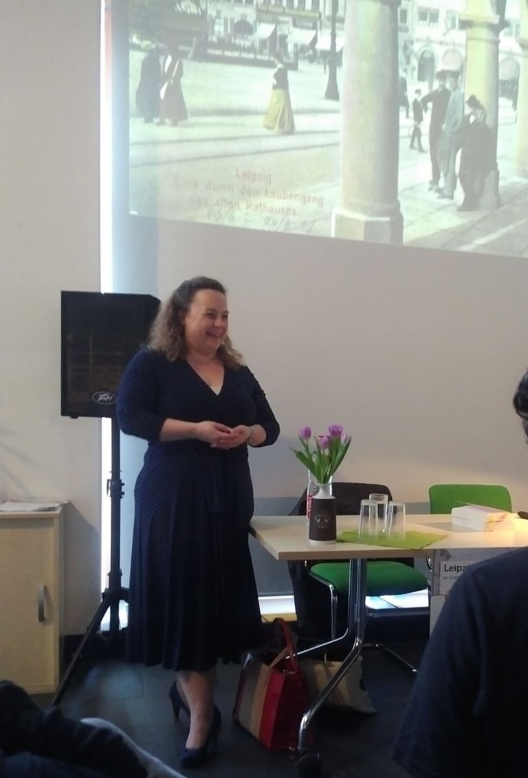 Die Räume des Infozentrums Georg-Schumann-Straße sind richtig klasse. Groß, hell, mit hoher Decke. Es war schon alles sehr schön hergerichtet und ich wurde freundlich empfangen. Als Begleitung zur Lesung hatte ich eine Präsentation mit gemeinfreien Fotos des Alten Leipzig dabei, so konnte ich die Handlungsorte gleich illustrieren und eine virtuelle Reise durch das wunderschöne Vorkriegsleipzig anbieten. Aufgrund der Großzügigkeit der Räume wurde diese Präsentation dann über mir herrlich großformatig angezeigt.